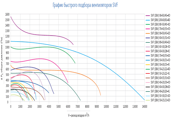 Вентиляторы SBV имеют 9 типоразмеров в зависимости от размеров соединительного фланца (АхВ). Каждому типоразмеру соответствует несколько вентиляторов, отличающихся количеством полюсов электромотора. При выборе вентилятора на требуемый расход воздуха и давление, действует правило: вентиляторы с большим количеством полюсов достигают требуемых параметров при более низких оборотах, что снижает шум и увеличивает ресурс их работы. Вентиляторы с большим количеством полюсов также имеют меньшую скорость воздуха в сечении, что снижает потери давления в воздуховоде и сетевом оборудовании. Серия выпускаемых однофазных и трехфазных вентиляторов SBV дает проектировщикам возможность оптимизировать все параметры при выборе вентиляционных установок с расходом воздуха до 9200 м3/ч.