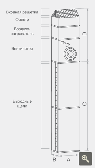 Воздушно тепловая завеса является модульной конструкцией, она состоит из прямоугольных канальных элементов и ряда других деталей.