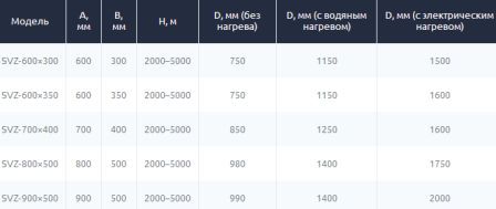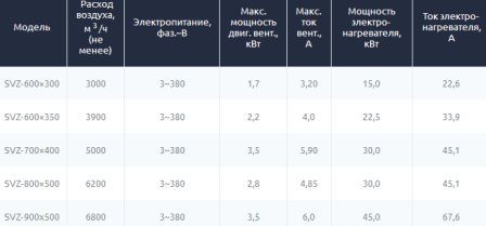 Выпускается шесть типоразмеров воздушно тепловых завес с расходом воздуха от 3075 до 9100 м 3 /час. Щелевые секции воздушно тепловых завес имеют длину - 1 и 1,5 м, а воздухозаборная решётка изготовлена из оцинкованного стального листа. Воздушно тепловые завесы представляют сборную конструкцию, базирующуюся на прямоугольных канальных элементах. Для защиты теплообменников от загрязнений в комплектацию завес типа SVZ входят кассетные фильтры SFP.